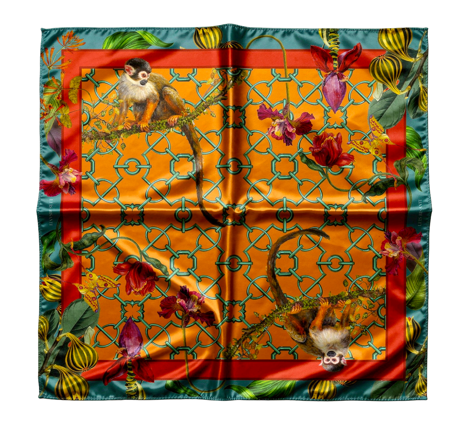 Confeccionada en satén suave y brillante, ofrece una caída elegante y un formato de 1 metro x 1 metro, ideal para usar al cuello, en el cabello o como accesorio de bolso. Una pieza que combina arte, lujo y personalidad.