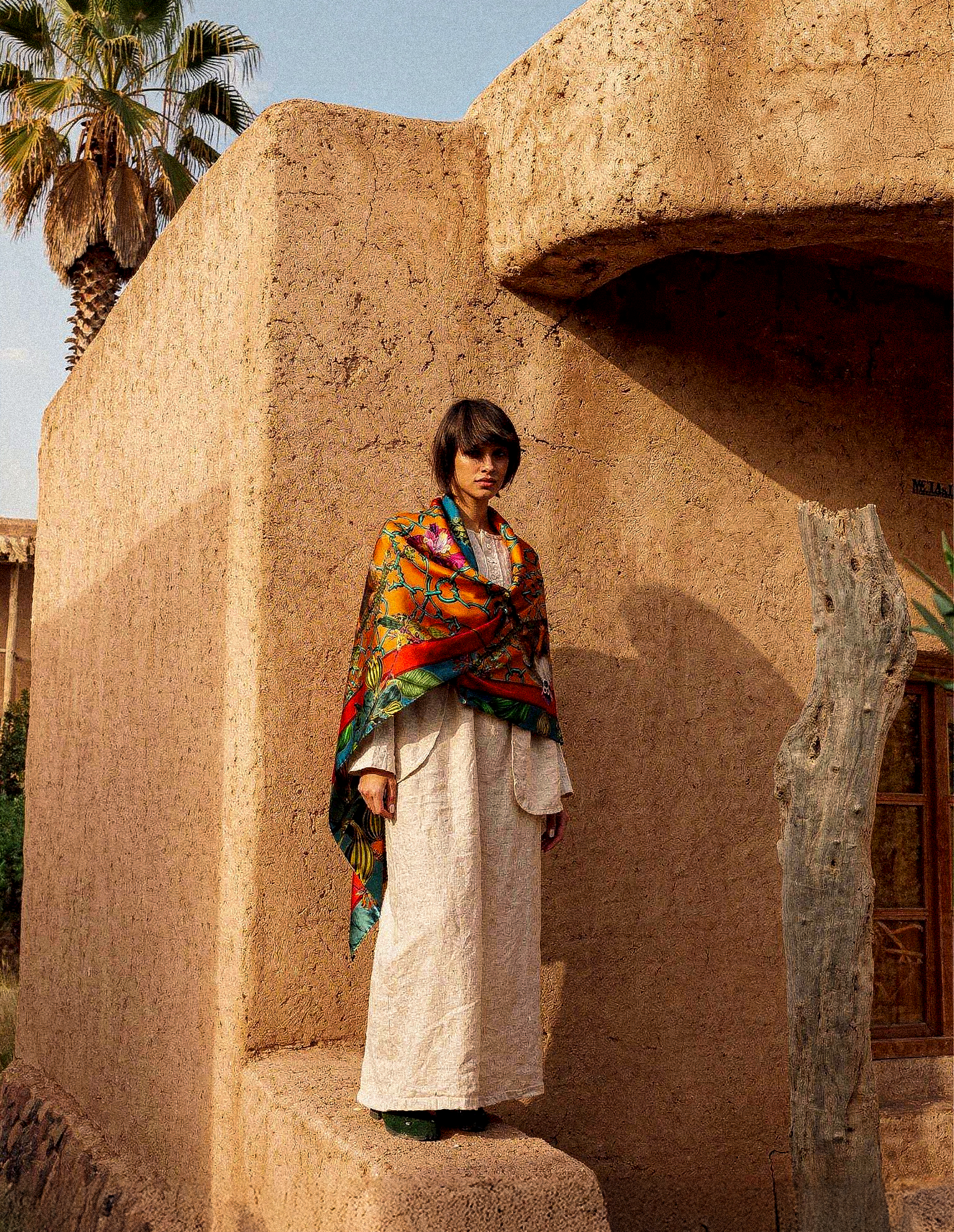 Confeccionada en satén de acabado luminoso, esta bufanda envuelve con suavidad mientras revela un diseño original inspirado en orquídeas y formas orgánicas que evocan sofisticación y carácter. Una pieza que aporta color, elegancia y una presencia única a cualquier look.