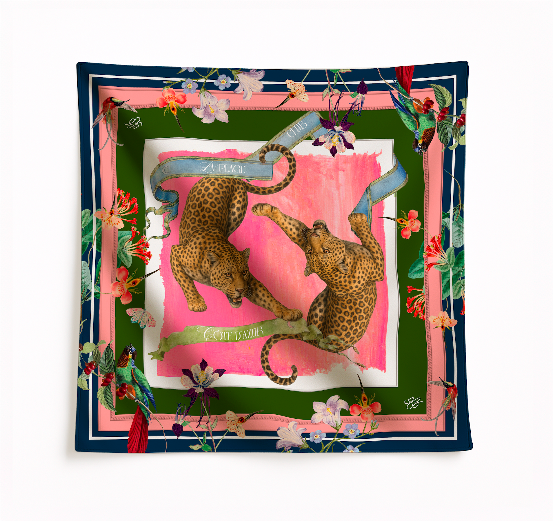 La Jungle Jaguar es una bufanda de satín que celebra la fuerza y la belleza salvaje con un vibrante dúo de jaguares en pleno movimiento. Su ilustración central, rodeada de flores tropicales, aves exóticas y un marco profundo en tonos rosa, verde y azul marino, crea una composición llena de energía y sofisticación.